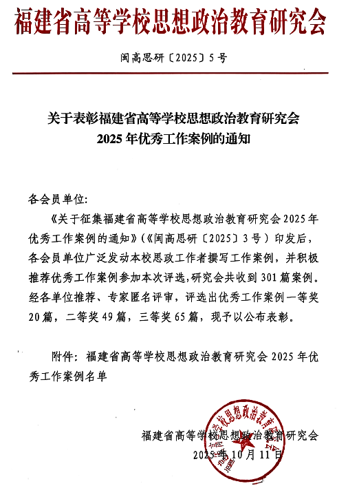 喜讯丨化工与材料学院工作案例荣获福建省高校思政教育研究会2025年优秀工作案例一等奖