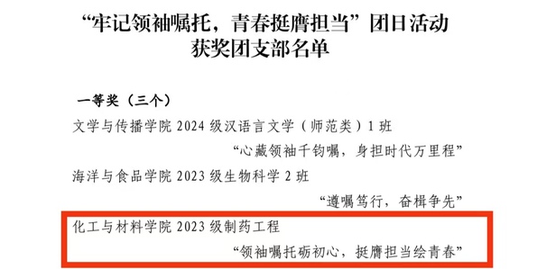 为深入学习贯彻习近平总书记关于青年工作的重要思想,深刻领悟习近平总书记致全国青联十四届全委会和全国学联二十八大的重要贺信精神,引导广大团员青年牢记习近平总书记的殷殷嘱托,坚定理想信念,厚植家国情怀,勇担历史使命,让自身成长成才与国家富强、民族复兴同向同行,在推进中国式现代化的新征程上奋力书写挺膺担当的青春篇章。在校团委组织的“牢记领袖嘱托,青春挺膺担当”主题团日活动中,我院2023级制药工程团支部获得一等奖。