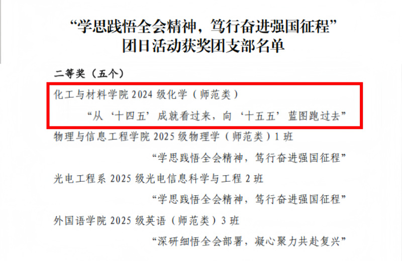 为深入学习贯彻习近平总书记重要讲话精神,深刻领悟党的二十届四中全会精神,激励广大团员青年在新征程上奋勇争先、再上台阶,化工与材料学院认真开展“学思践悟全会精神,笃行奋进强国征程”主题团日活动,在校团委组织的全校评比中,2024级化学(师范类)团支部获得二等奖。