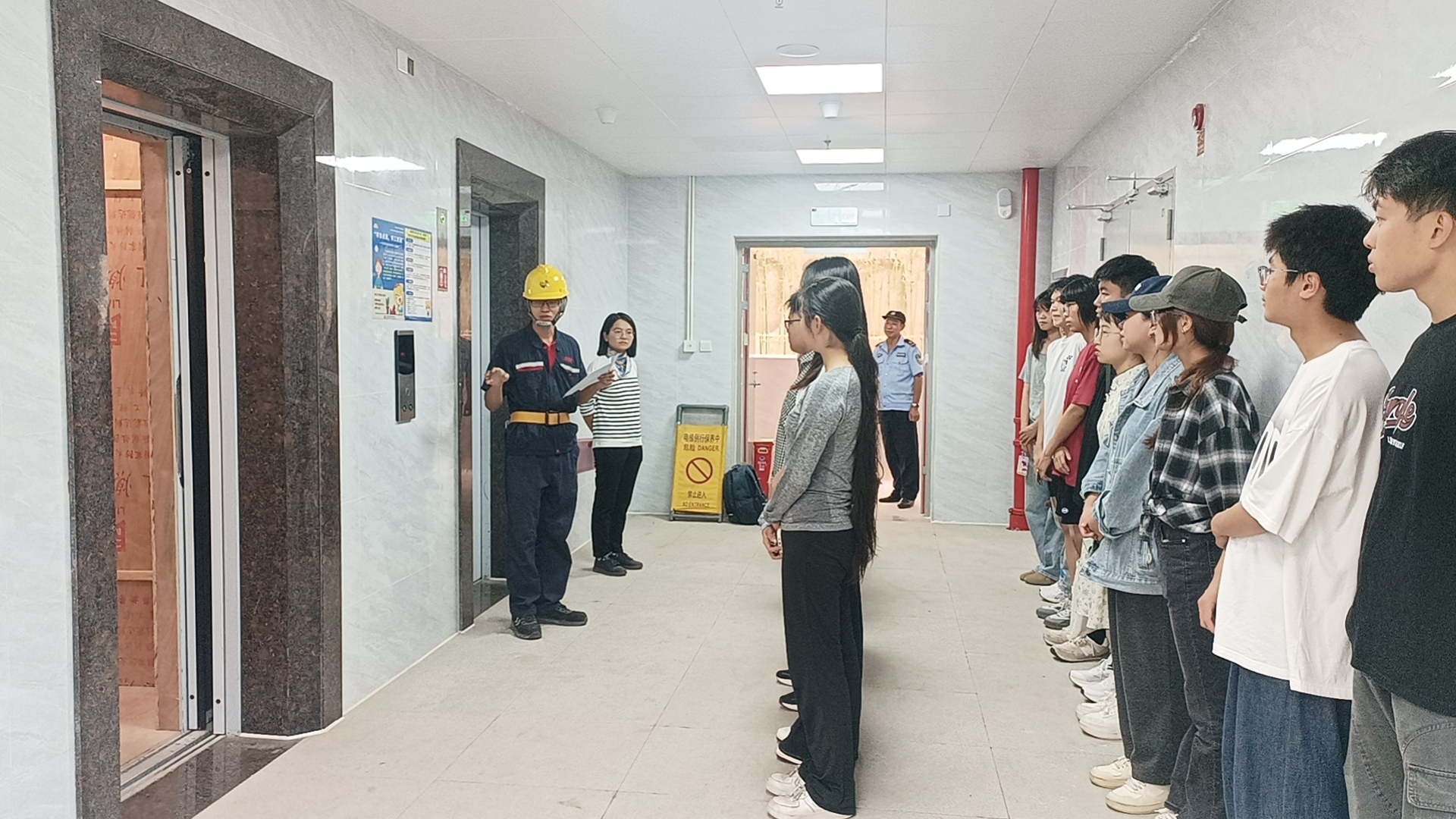 演练开始前,现场工作人员向学生讲解了乘坐电梯的安全常识、被困时的注意事项以及本次演练的步骤。本次演练模拟了电梯紧急停梯、电梯困人、故障解除等场景和一键对讲报警、心理安抚等实操。