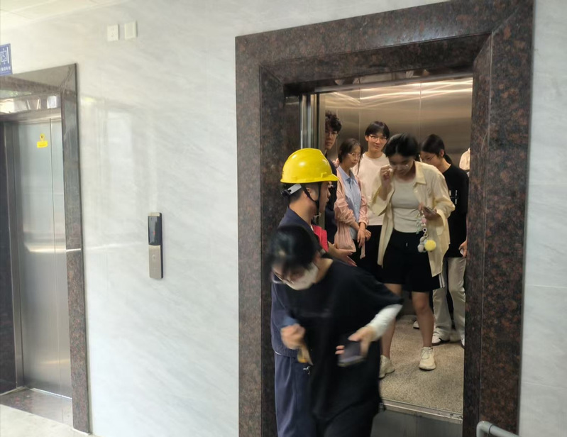 演练开始前,工作人员向学生强调遇到乘梯被困时要“保持冷静、切勿扒门、及时呼救”,并演示了电梯一键报警装置的使用流程。本次演练模拟了电梯紧急停梯、电梯困人、故障解除等场景和一键对讲报警、心理安抚等实操。