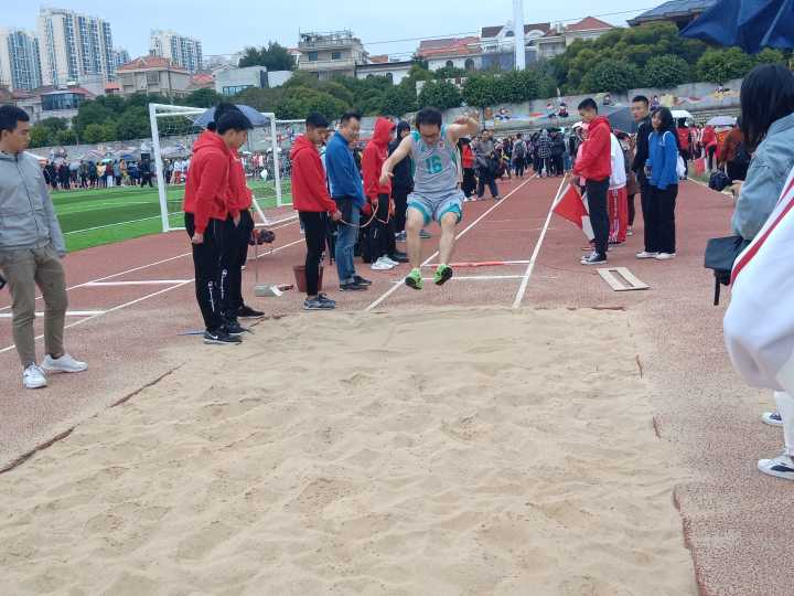 比赛过程中,洪钦赐严格遵守比赛规则,认真、严谨、一丝不苟的精神让人敬佩。起跑前紧绷的身躯,蕴含着无穷的能量;起跳时跨越的姿态,藏不住满满的自信。落地,正身,一气呵成。忽的,掌声和呼声同时响起,洪老师从容自若,淡定离开沙坑,迎接下一场比赛。