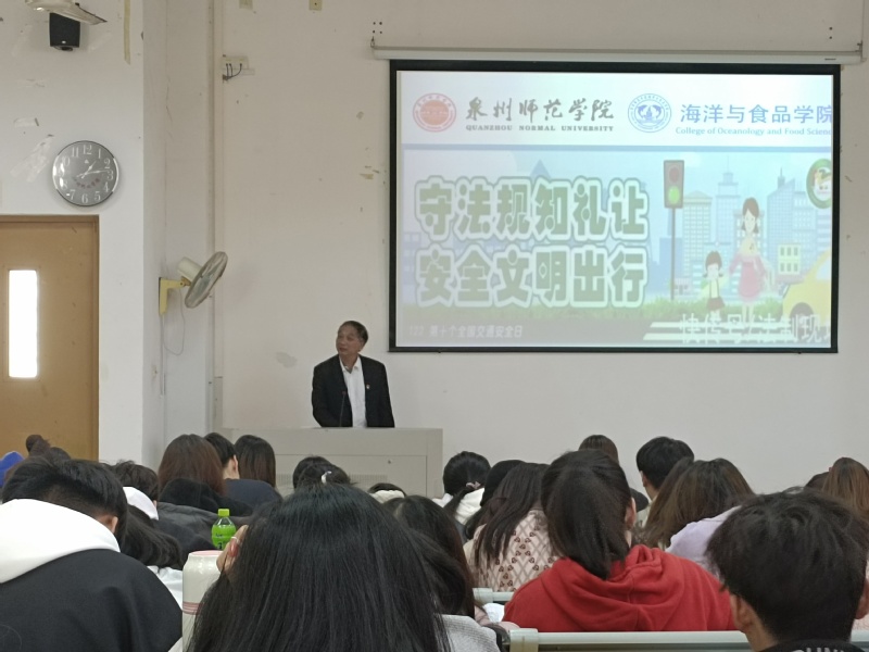 12月2日,海洋与食品学院在理工楼320教室开展文明交通安全教育活动,学院党委书记蔡英卿教授出席活动,全体学生骨干参加会议。
