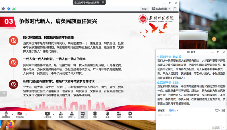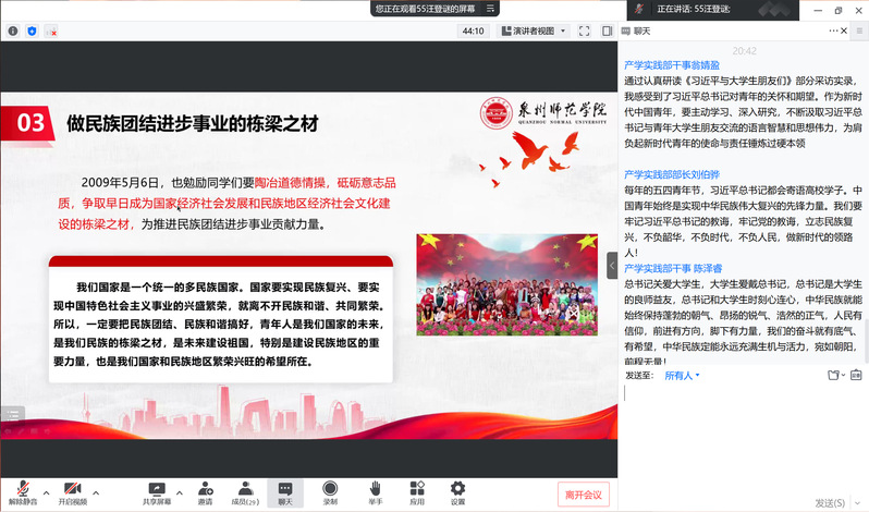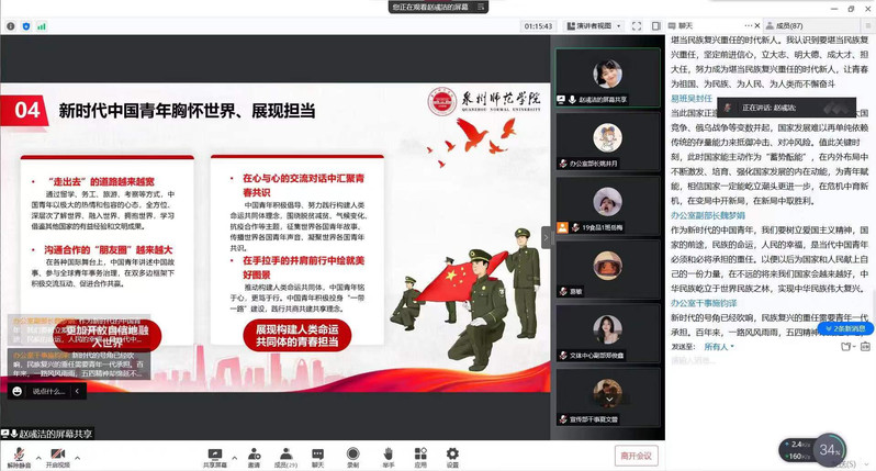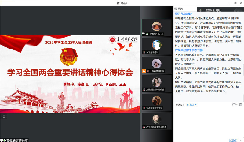此次培训采用线上形式,学院学生会主席团成员和团委会主席团成员分别作为主讲人,带领学生会成员们进行了“学习中国青年运动史”“学习习近平总书记考察中国人民大学重要讲话精神”“学习全国两会重要讲话精神”“学习《新时代的中国青年》白皮书”“学习《习近平与大学生朋友们》”等5个主题的学习。课堂上,同学们踊跃发言,畅谈感悟,学习氛围十分浓厚。大家纷纷表示,将自觉加强理论学习,坚定理想信念,积极向党组织靠拢,充分发挥学生干部的模范带头作用,努力成长为担当民族复兴大任的时代新人,以实际行动和更优异的成绩迎接党的二十大胜利召开。