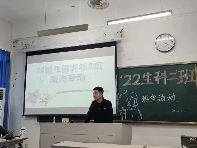 114日,学院团干部、辅导员乐生煊为2022级生科2班的同学开展“学习二十大,永远跟党走”主题教育班会,带领同学们学习党的二十大精神的重大意义及二十大关于党的建设新论断新部署新要求。班会还设置了合唱环节,在《我和我的祖国》的旋律中,同学们的思想和精神再一次受到洗礼。班会最后,乐生煊寄语同学们:“要立志做有理想、敢担当、能吃苦、肯奋斗的新时代好青年,以实际行动践行‘请党放心 强国有我’的誓言”。