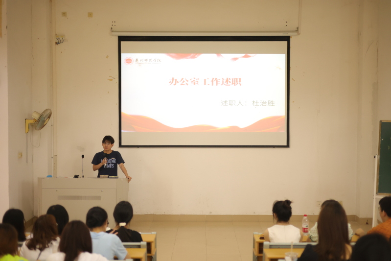 学生会主要工作成员从政治态度、道德品行、学习情况、工作成效、纪律作风五方面对自身及所在部门过去一学期的工作情况进行了汇报。参会老师和学生代表根据各位参评人员的述职内容,依据评议准则,进行了客观、公正的无记名评分