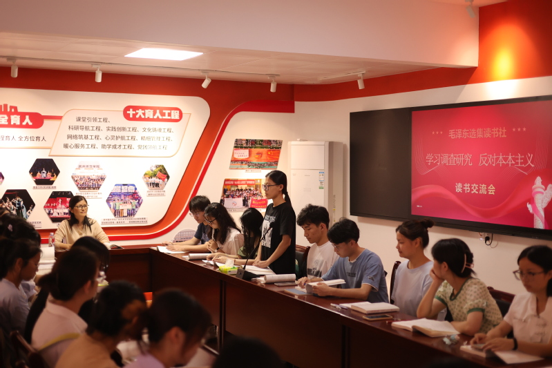 会上,指导老师带领读书社成员们共同研读《反对本本主义》和《寻乌调查》两篇著作,深入学习贯穿其中的思想理论、精神内涵和工作方法。随后,读书社成员们结合自身经历谈起感悟和认识。“正确的决策离不开调查研究,正确的贯彻落实同样也离不开调查研究”“在开展调查研究中,必须坚持问题导向,增强问题意识,敢于正视问题、善于发现问题,以解决问题为根本目的,真正把情况摸清、把问题找准、把对策提实,不断提出真正解决问题的新思路新办法。”“‘世界上没有两片完全相同的树叶’,也没有完全通用的模式。”大家在交流互动中碰撞思想火花,现场“金句”频出,不时响起热烈的掌声。