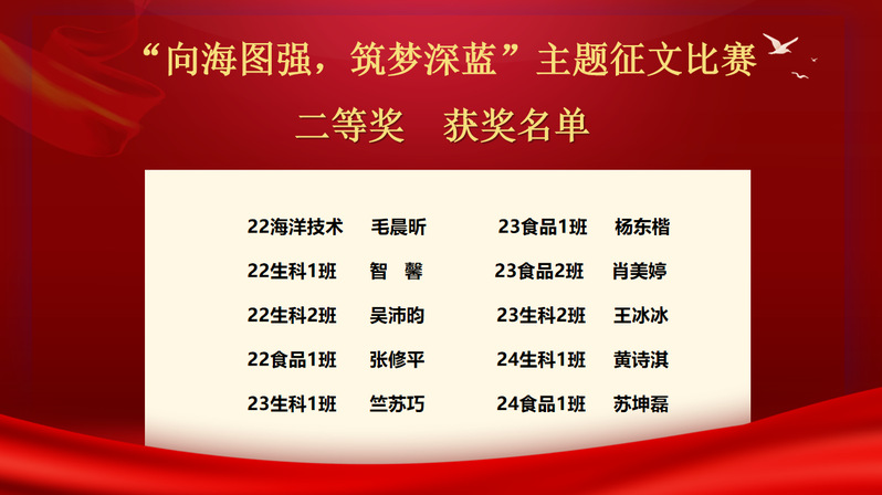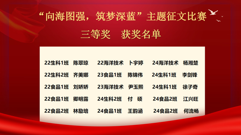 活动精心选取《向海》《山海经》《马江半小时》《海族列传》海洋文化书籍作为共读书目,引导同学们以专业视角深入挖掘海洋文化内涵,探寻海洋发展路径。同学们积极响应,踊跃参与,从多视角剖析海洋文化。有同学凭借海洋生物学知识,探讨生物多样性保护与开发;有同学结合海洋科技海洋贸易等内容,阐述福建海洋经济发展脉络。作品既展现了学生扎实的专业知识,又饱含对海洋事业的热爱和家国情怀,彰显出他们对海洋文化的深刻理解,以及建设海洋强国的责任担当。为表彰优秀、树立榜样,学院隆重举办了颁奖仪式。