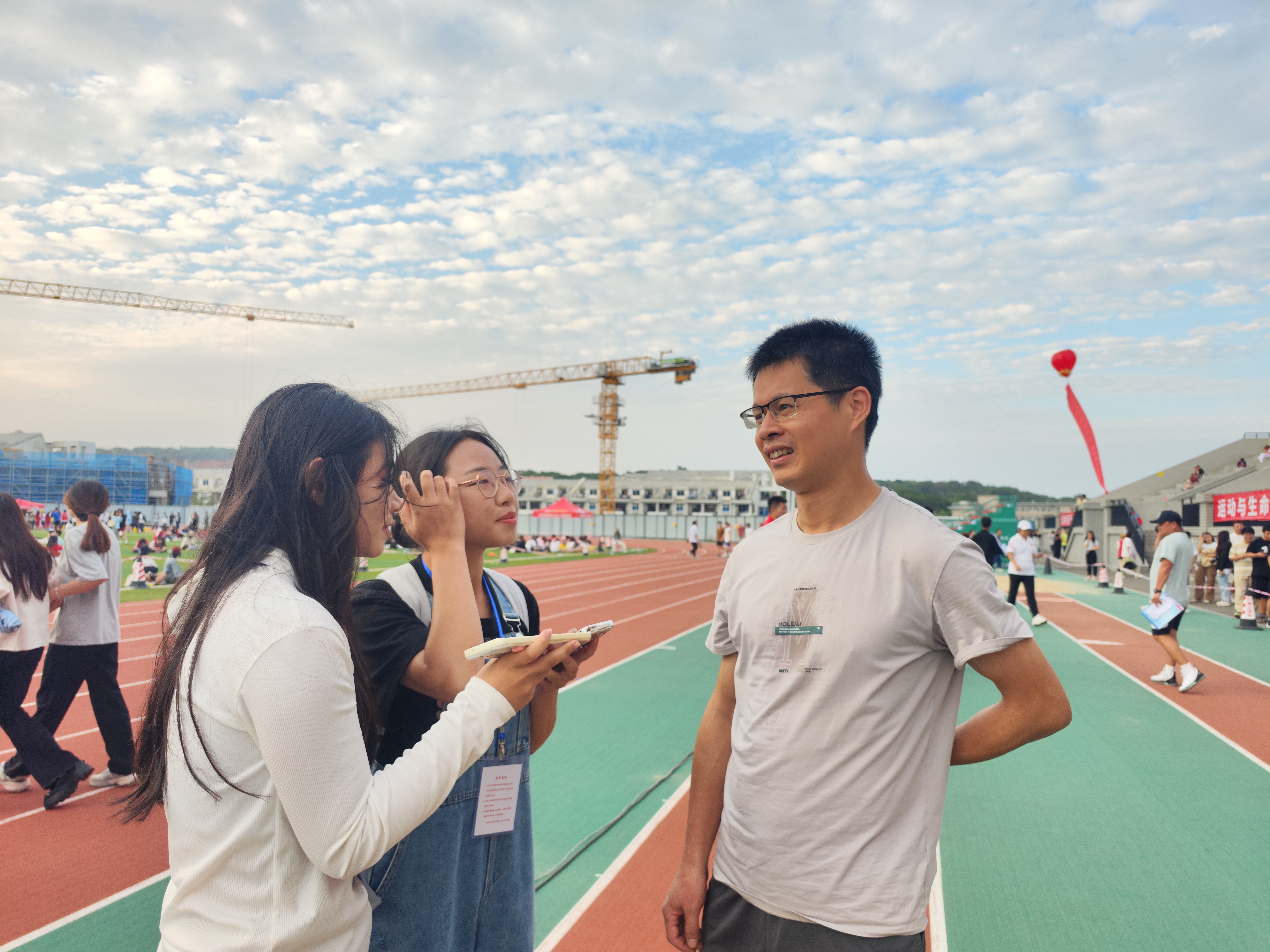 (图为郑鹏海同志夺冠后接受采访)