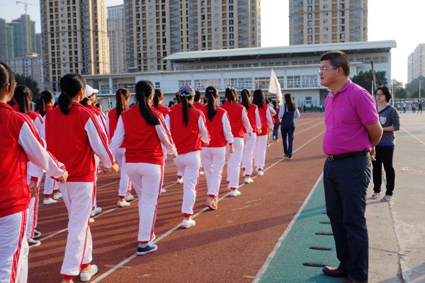 下午4:00整,我院护旗手举着院旗带领着鼓队、广场舞、广播操队员入场,宣告校运会彩排正式拉开序幕。伴随着富有节奏的鼓声,方阵跨着铿锵有力的步伐从主席台前走过,其整齐划一的队形向在场观众展示着教科学子的蓬勃向上之貌。方阵退场后,首先进行的是广播操演习。队员们个个精神抖擞,一丝不苟地做好每一个动作,从预备运动到整理运动,一伸手,一抬腿,每一式都刚劲有力, 把广播体操的力与美完美的结合在一起。选手们穿着红白相间的院服,与红色的田径跑道相映成辉,在午后柔和的阳光下形成一道靓丽的风景线。紧接着,广场舞队员们冲向场中,在歌曲《咆哮》的伴随下,潇洒帅气地舞动身姿。他们酷炫的舞姿,张扬的个性,瞬间煽动了同学们的热情。彩排后,我院陈一祥书记对此次彩排做了指导工作,他指出队伍还是存在些许不足之处,并强调要在队伍的整齐度、队员的表情及队形的变换上多加练习。随后,陈一祥书记等一行还到运动员训练地,了解运动员的训练情况。