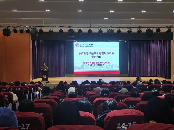 为进一步推进教育科学学院学风工作和强化作风纪律建设,12月26日下午,教育科学学院组织召开学生期末诚信教育大会暨教育警示大会,会议由院学工办陈宸老师主持,教育科学学院2019-2021级全体学生1200余人分批次参会。