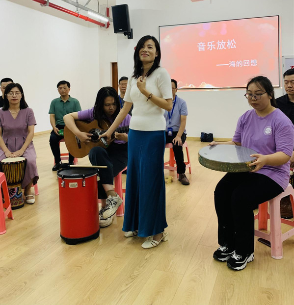 党员老师陈佳带领大家进行深度音乐放松之后,详细介绍了乐器的种类、使用方法以及鼓圈活动的要素和特点。她强调,在鼓圈活动中,参与者不需要具备音乐背景,演奏中也没有严格的对错标准与评判。鼓圈的目的是让大家在轻松愉快的演奏过程中,建立共同体,获得积极能量,促进身心健康。每一位参与者都能够轻松参与其中。
