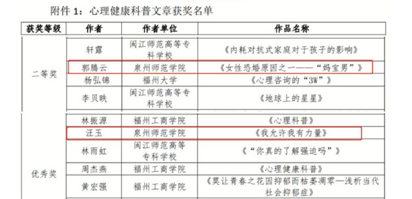 6月28日,福建省心理健康研究会首届心理健康科普作品大赛获奖名单公布。教育科学学院学子总计获奖五项。其中,在心理健康科普文章项目中,教育科学学院研究生郭腾云《女性恐婚原因之一——“妈宝男”》获得二等奖,应用心理学本科生汪玉《我允许我有力量》获得优秀奖;在心理健康科普短视频项目中,教育科学学院研究生刘思宇《如果,给自己一次机会》、王瑞锋《关注心理健康,发现音乐治疗》获得一等奖,魏扬帆《心理健康》获得二等奖。