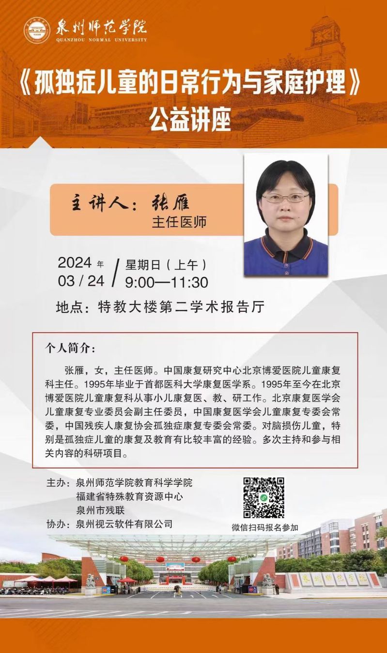 讲座预告:张雁 《孤独症儿童的日常行为与家庭护理》