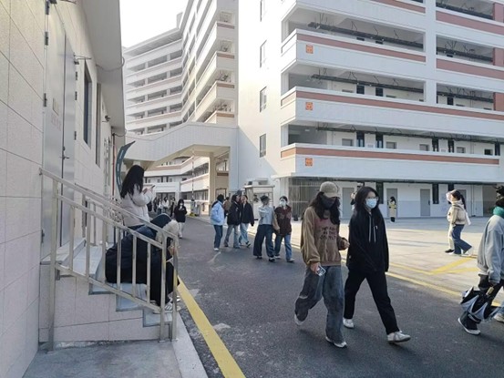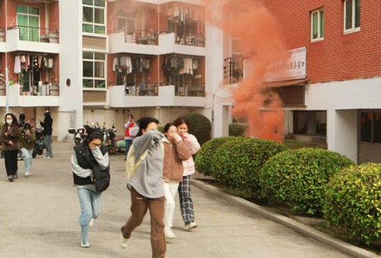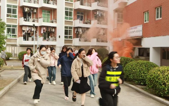 下午3点,随着急促的警报声和哨声的响起,演练活动正式拉开序幕。全体宿舍区学生迅速按照预定的疏散路线,有序地从各自宿舍撤离。在宿管人员和学生志愿者的引导下,学生们弯腰低头、捂住口鼻,井然有序地疏散到指定的安全集合地点。整个过程紧张而有序,全体参演人员安全集结到了学校第二田径场的指定区域。
