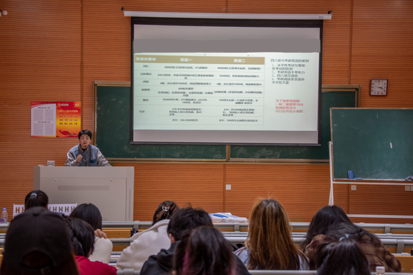 讲座伊始,庄老师凭借丰富的教学经验和对考研动态的精准把握,深入浅出地剖析了当前考研的整体形势,包括历年报考人数变化、录取分数线走势、热门专业与院校分析等内容,让同学们对考研的大环境有了更为清晰的认识。在院校专业选择的关键环节,庄老师引导同学们从自身兴趣、职业规划等多角度进行思考,并分享了获取有效信息的渠道,助力大家做出适合自己的选择。在备考策略环节,庄老师从公共课和专业课两个维度展开,详细分享了各科目复习计划制定、学习资料选择、时间管理技巧等实用经验。