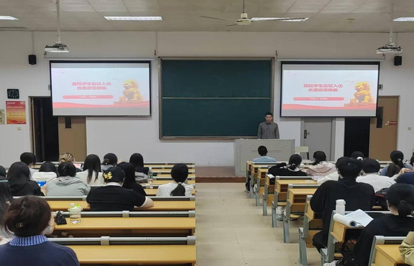 陆正瑜围绕高校大学生应征入伍优待政策,从学费补偿、考研加分、就业安置、国家资助、家庭优待、部队选拔培养、复学政策、升学优惠、退役后技能培训、退役后就业创业服务等方面政策进行详细解读,让同学们切实了解参军入伍在学业和职业发展上的优势。促进同学们对参军有新的认识和兴趣,鼓励同学们投身军旅,在绿色军营中绽放青春光彩。