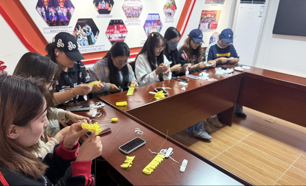 在最后的手工制作花朵环节中,同学们分组协作,一朵朵绚丽的花朵在指尖绽放,象征着各民族紧密相连、共同繁荣。