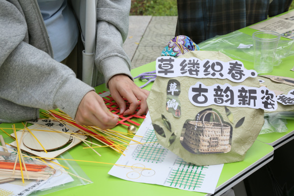 现场草叶簌簌与篾条翻飞之声相和,同学们通过揉捻润泽的蒲草,在挑一压一的经纬交错中解锁绞编、缠边等非遗技法,编织出不同形状的草编作品,并将铃铛缀于竹编之下,实现了传统技艺的质朴之美与现代审美完成诗意对话,也在动手实践中感悟匠心精神。