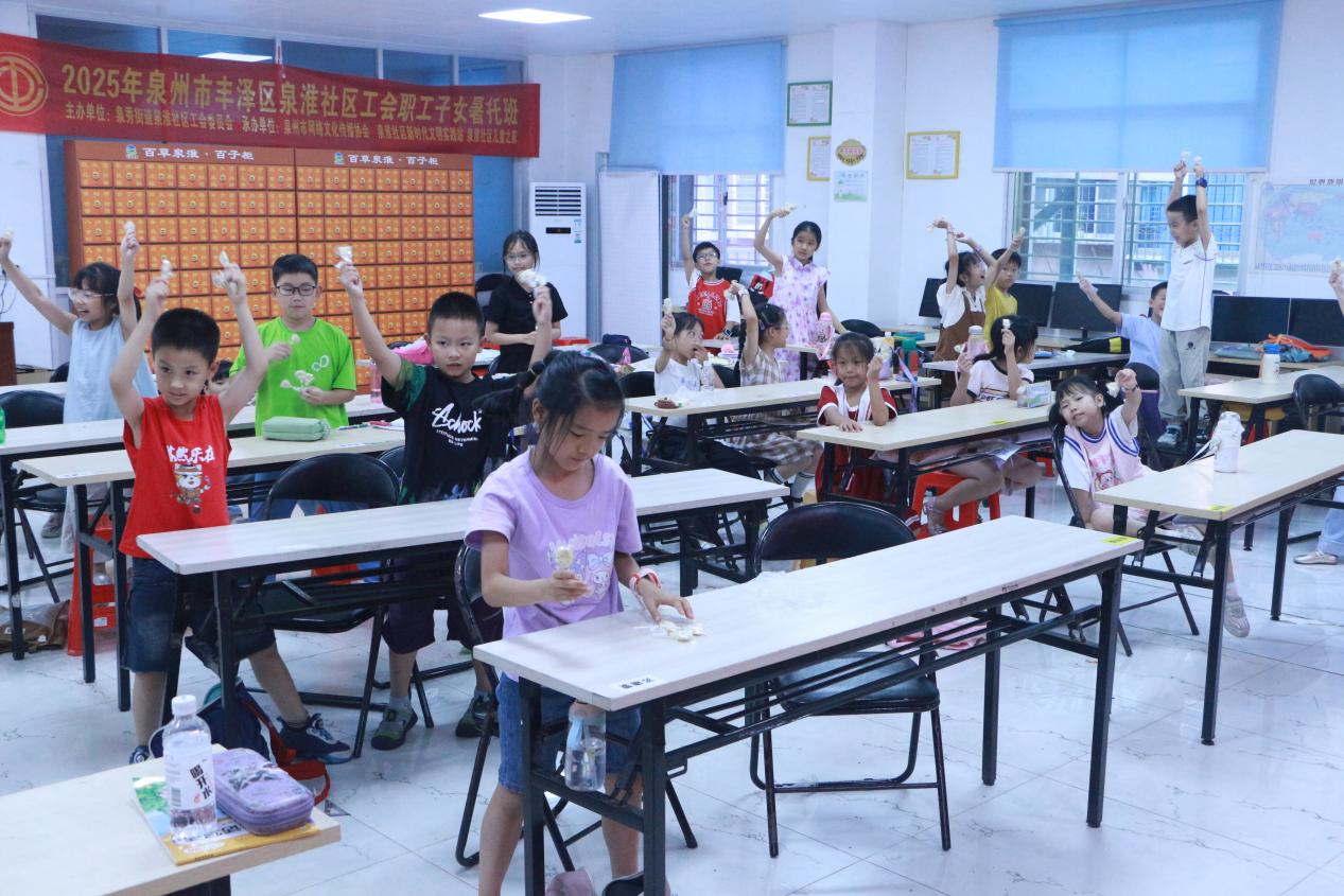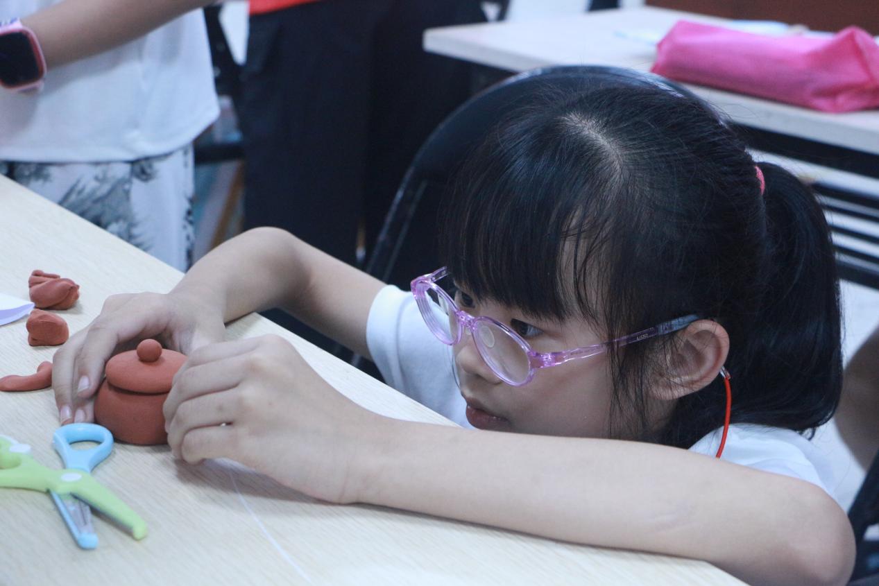 实践队成员创新融合“理论讲解+茶礼实践+手工创作”,以生动讲述和细致示范,从泉州非遗茶文化的历史故事、文化寓意,到茶礼动作中蕴含的尊重与和谐,再到茶主题文创的制作要点多方面展开,同时利用彩色黏土、冰箱贴等材料,深入讲解端杯行礼姿态、简易茶礼流程及黏土茶具捏制、茶元素冰箱贴创作方法,将抽象文化转化为可感体验,为小朋友们构建全方位、多维度的茶文化场景,让孩子们在听、学、做中加深对泉州非遗茶文化的理解与认同,提升文化感知与动手能力。