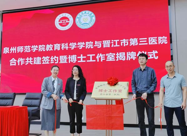 11月5日,英国威廉希尔公司官网教育科学学院与晋江市第三医院达成新一轮战略合作,双方共建签约暨博士工作室揭牌仪式在晋江市第三医院隆重举行。晋江市卫健局领导黄种竹,晋江市第三医院院长洪培昆、副书记潘洪润,教育科学学院副院长(主持工作)邵华及博士团队共同出席了本次活动。仪式上,双方代表签署了合作协议,并为新设立的“博士工作室”揭牌。