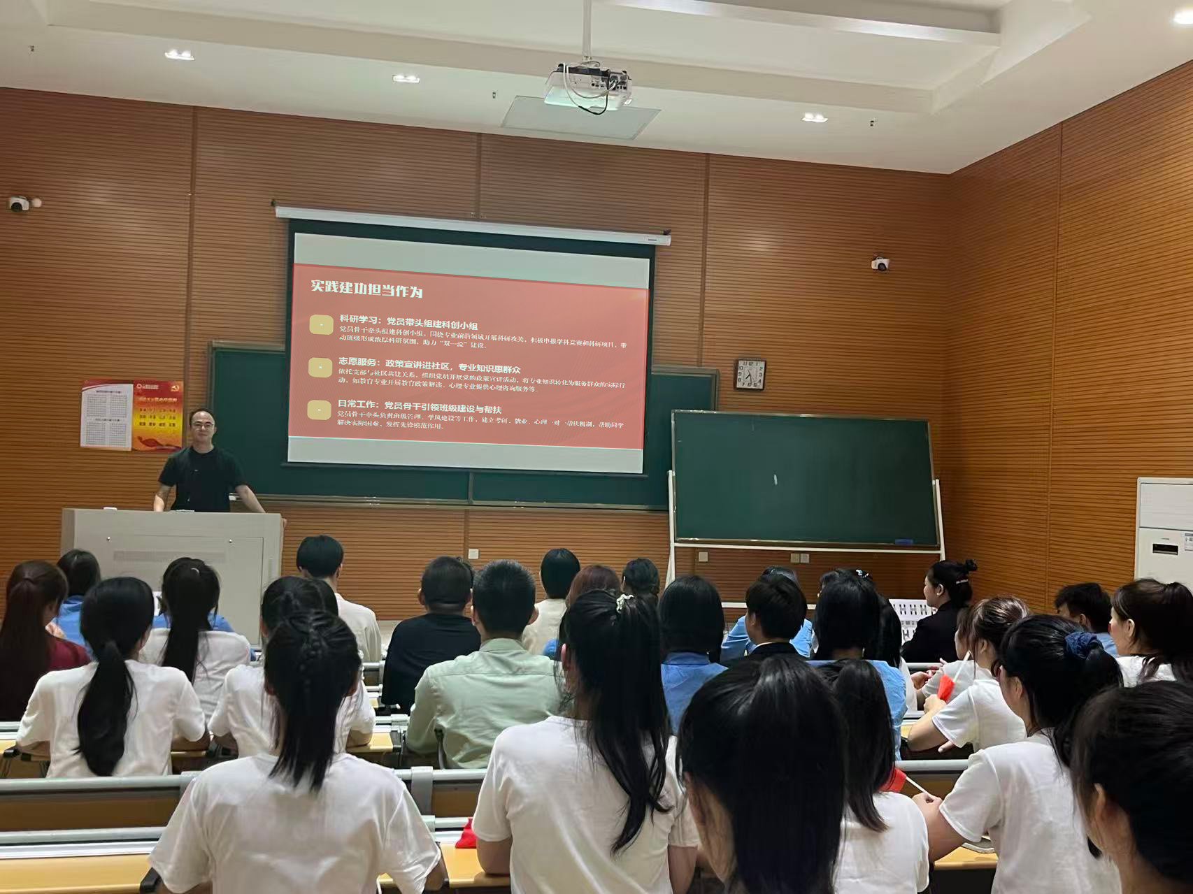 团委委员陈宸以“深学全会精神强信念 青春担当使命践初心”为主题开展宣讲,紧扣青年党员“修德立身、笃行成才”的追求,阐释全会精神对成长成才的指导意义,并结合新质生产力、乡村振兴等国家战略,鼓励青年学子将个人追求融入党和国家事业,在教育实践、科研创新中提升素养、挺膺担当。