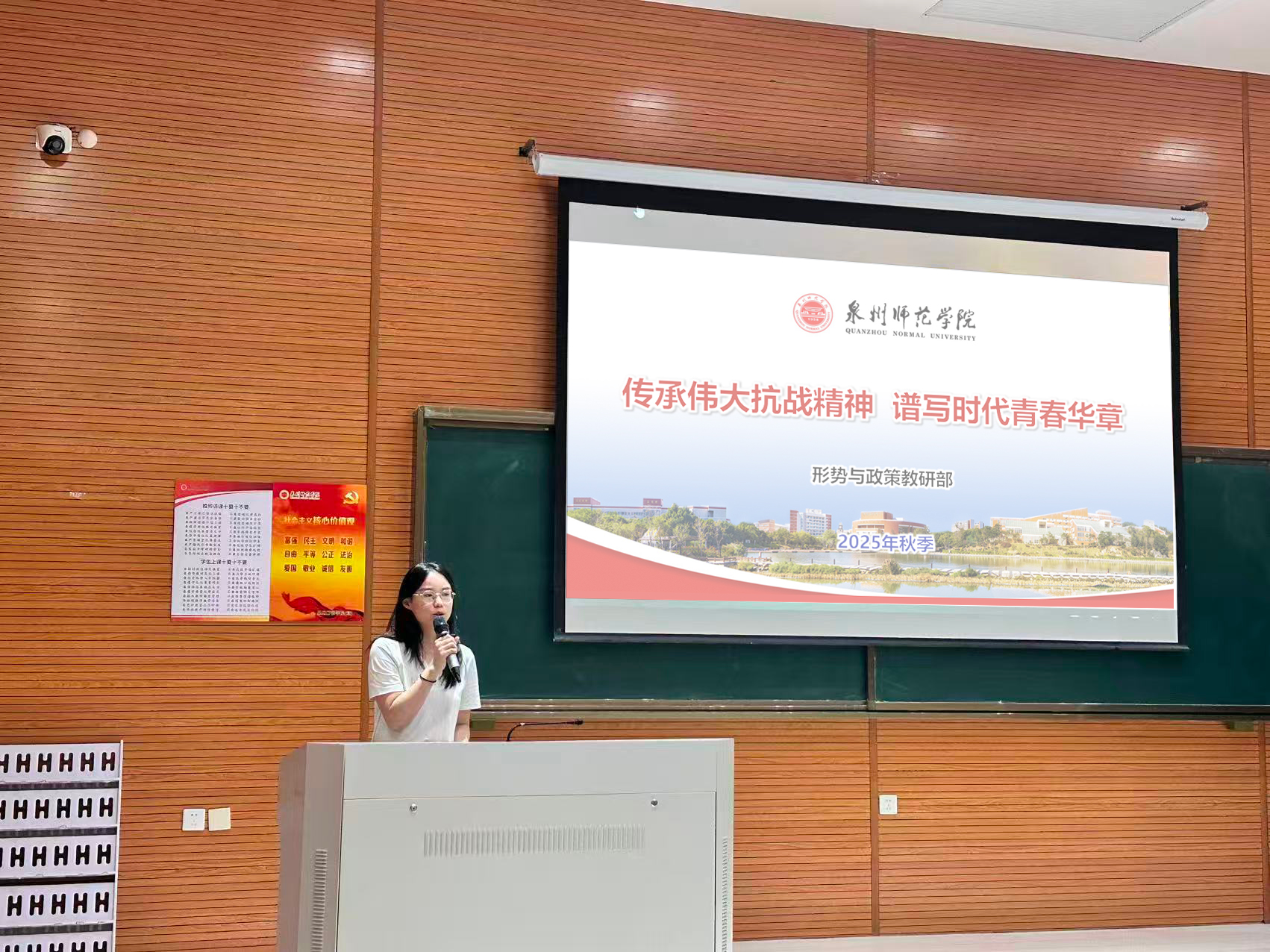 团委委员林霖通过《形势与政策》“传承伟大抗战精神 谱写时代青春华章”专题课程,与同学们共同剖析伟大抗战精神的内涵,引导青年在新时代赓续天下兴亡、匹夫有责的爱国情怀,练就百折不挠、坚忍不拔的意志品格,以昂扬斗志投身强国建设、民族复兴的新征程。
