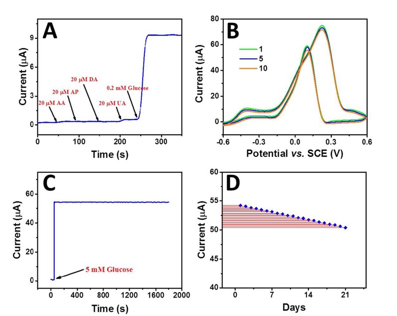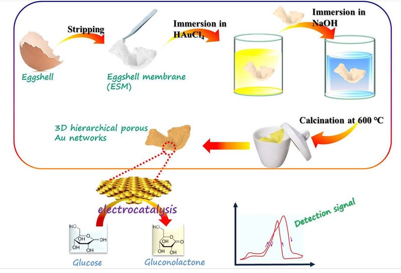 该材料遗传了蛋壳膜本身结构的特点,特别适用于构建葡萄糖无酶传感器电极,可在0.1 V的低电压下进行驱动,展现了出色的葡萄糖检测性能,并具有低检测限、快速响应时间等优势。