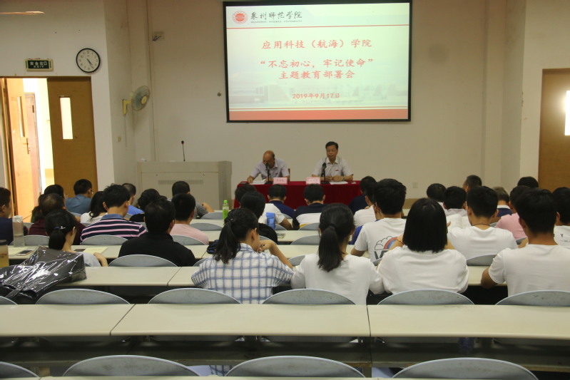 2019年9月17日下午,应用科技(航海)学院在理工楼218教室召开“不忘初心、牢记使命”主题教育部署会。会议由院党委苏国柱书记主持,校党委第四巡回指导组组长黄振平同志到场讲话。学院全体师生党员参加了会议。