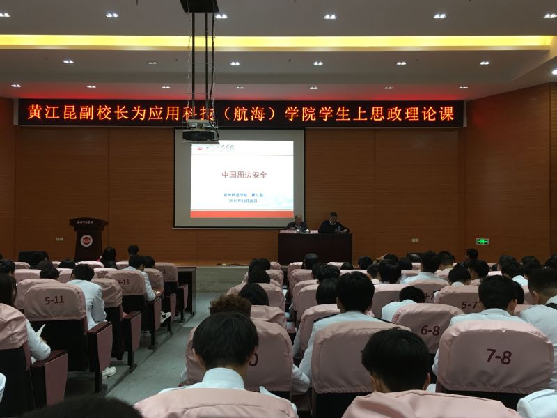 12月26日下午,副校长黄江昆在特教大楼第二学术报告厅为应用科技(航海)学院学生讲授主题为《中国周边安全》的思想政治理论课。应用科技(航海)学院2018级全体学生和部分教职工到场听课。