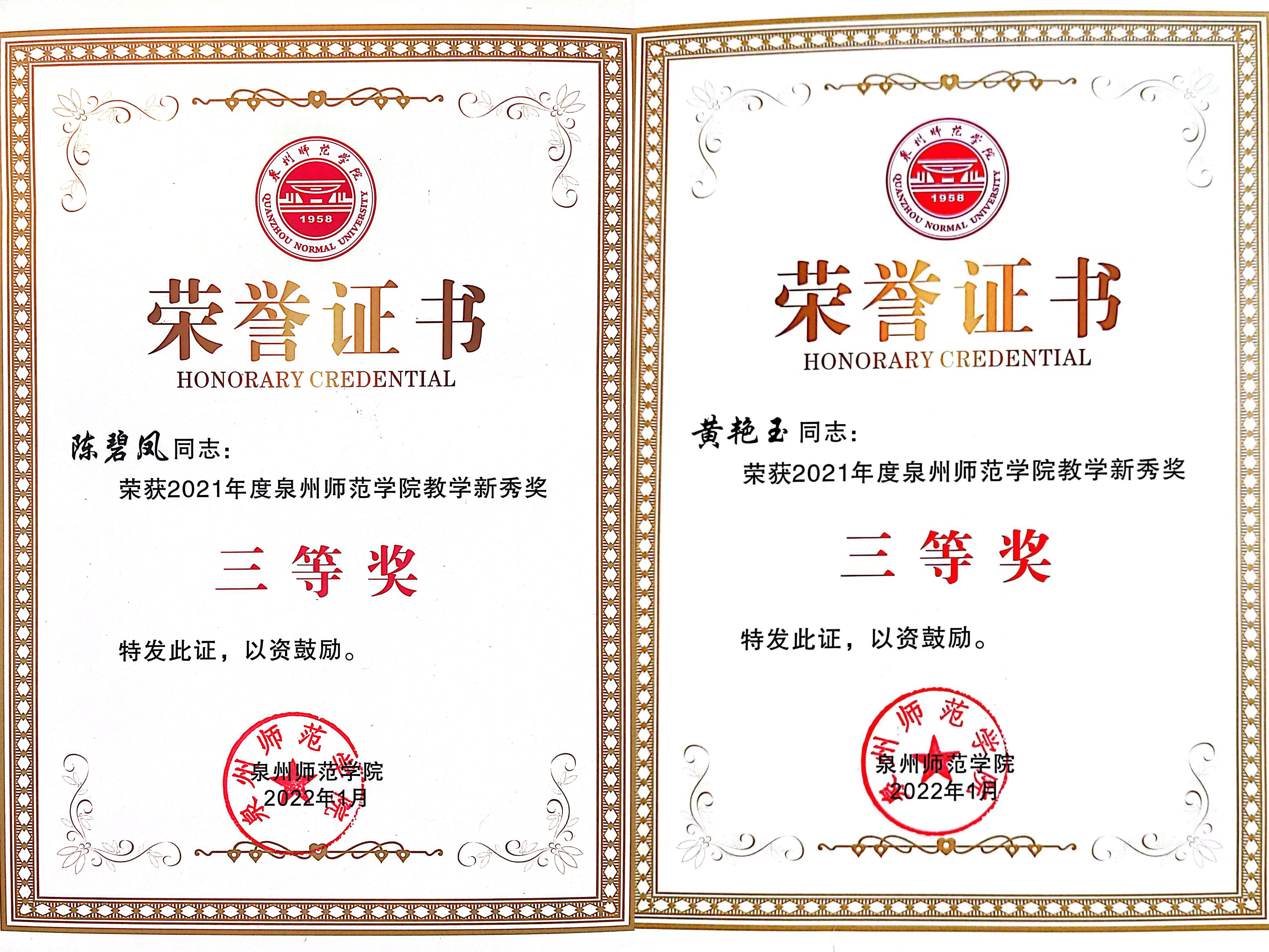 英国威廉希尔公司官网2021年度本科教学新秀奖评选结果日前公布,我院陈碧凤、黄艳玉老师荣获三等奖。