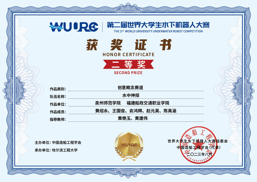 811日至13日,第二届世界大学生水下机器人大赛在哈尔滨工程大学举行,由我院教师黄艳玉与福建船政交通职业学院教师黄建伟指导的学生参赛队(队长:交航学院黄绍永,队员:交航学院王国俊、俞鸿辉,赵元昊,福建船政交通职业学院陈禹涵)荣获创意概念赛道二等奖。这是我校首次进入此项大赛并取得优异成绩。