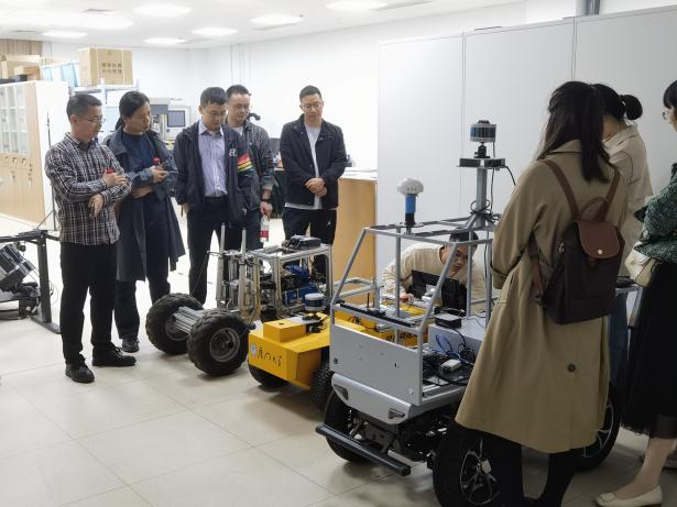 祝青园教授带领我院教师深入参观了实验室的多个关键研究区域,对科研设施、智能车辆领域的科研项目以及取得的成果进行了全面深入的介绍,同时展示了实验室在环境感知、路径规划、车辆控制等关键技术领域的创新成果,其团队的博士和硕士生们也重点介绍并演示了一系列尖端实验设备,这些设备在智能车辆领域均属技术前沿。