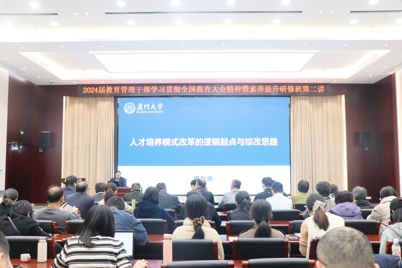 12月11日,在2024年教学管理干部学习贯彻全国教育大会精神暨素养提升研修班第二讲上,厦门大学博士生导师史秋衡教授应邀讲授“人才培养模式改革的逻辑起点与综改思路”。副校长陈秋燕出席并主持活动,二级学院(系)分管教学副院长、教学科研办负责人、教学督导员、专业主任和教研室主任等90余人参加培训。