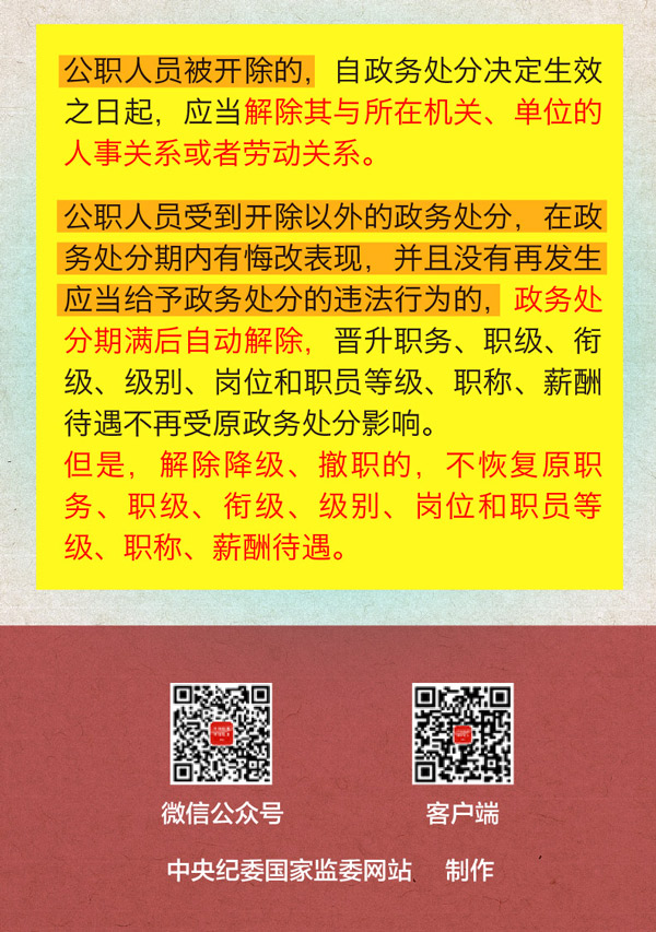 公职人员受到开除以外的政务处分,在政务处分期内有悔改表现,并且没有再发生应当给予政务处分的违法行为的,政务处分期满后自动解除,晋升职务、职级、衔级、级别、岗位和职员等级、职称、薪酬待遇不再受原政务处分影响。但是,解除降级、撤职的,不恢复原职务、职级、衔级、级别、岗位和职员等级、职称、薪酬待遇。