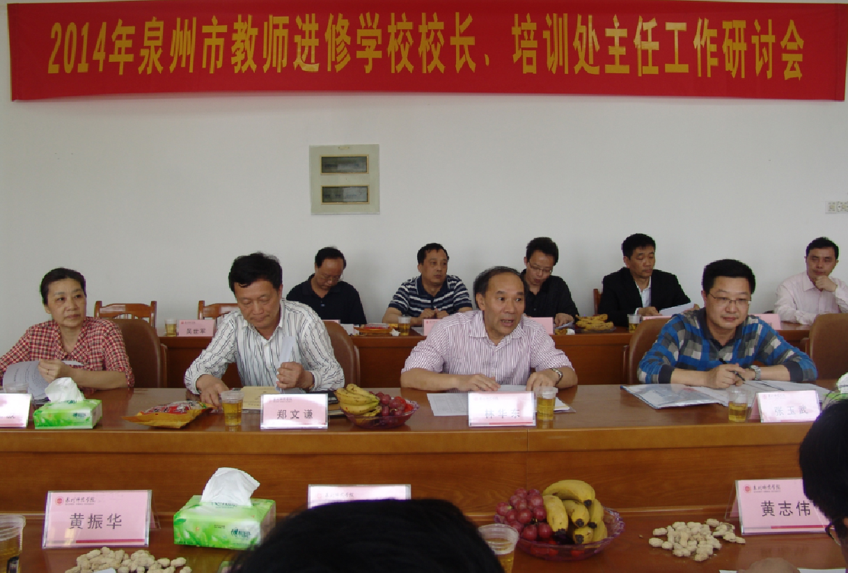 4月18日,2014年泉州市教师进修学校校长、培训处主任工作研讨会在荣茂楼四楼会议室举行。我校林华东副校长,泉州市教育局人事科、继续教育学院领导出席会议。继续教育学院党总支书记张玉武主持研讨会。来自泉州市11个县市区教师进修学校的校长、培训处主任以及继续教育学院各中心科室负责人参加会议。