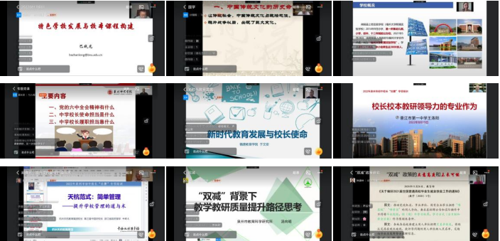 培训班第一阶段培训为期6天,采用线上培训方式进行。来自全市88名初中校长、书记参与培训。培训主要包括学习党的十九届六中全会精神和习近平总书记关于教育的重要论述、“双减”政策背景下的学校教育教学改革、校长科研领导力、现代学校管理等内容。培训班旨在通过培训学习,进一步提升泉州市初中校长的教育理论素养、教育管理能力,着力打造一支师德高尚、业务精湛、结构合理、充满活力的创新型初中校长队伍。