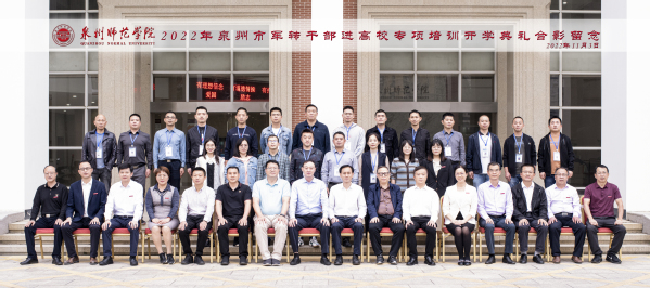 开学典礼前,校党委书记朱世泽,校长屈广清,副校长夏侯建兵等校领导会见泉州市退役军人事务局局长唐良元与泉州市教育局二级调研员毛伟雄,并与全体军转干部学员合影。