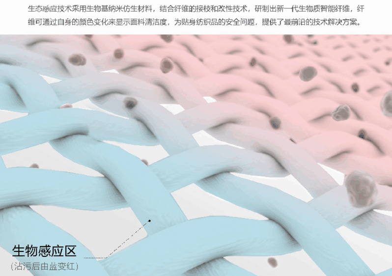 纺织品在人体穿着和使用过程中,会沾染皮肤排泄的油脂、汗液以及其它代谢物,而这些污渍很难通过肉眼察觉,却为病菌的生长和繁殖提供了重要的营养成分。生态感应技术可赋予纺织品自感知清洁度的功能,通过对天然提取物和纺织品的重构复合,使得沾染到纺织品上的油脂、汗液和细菌代谢物等污渍积累到一定量后产生显色变化,从而提醒我们及时清洁,最大程度上杜绝污渍的长期积累,导致病菌的大量繁殖,进而影响人们的健康状况。