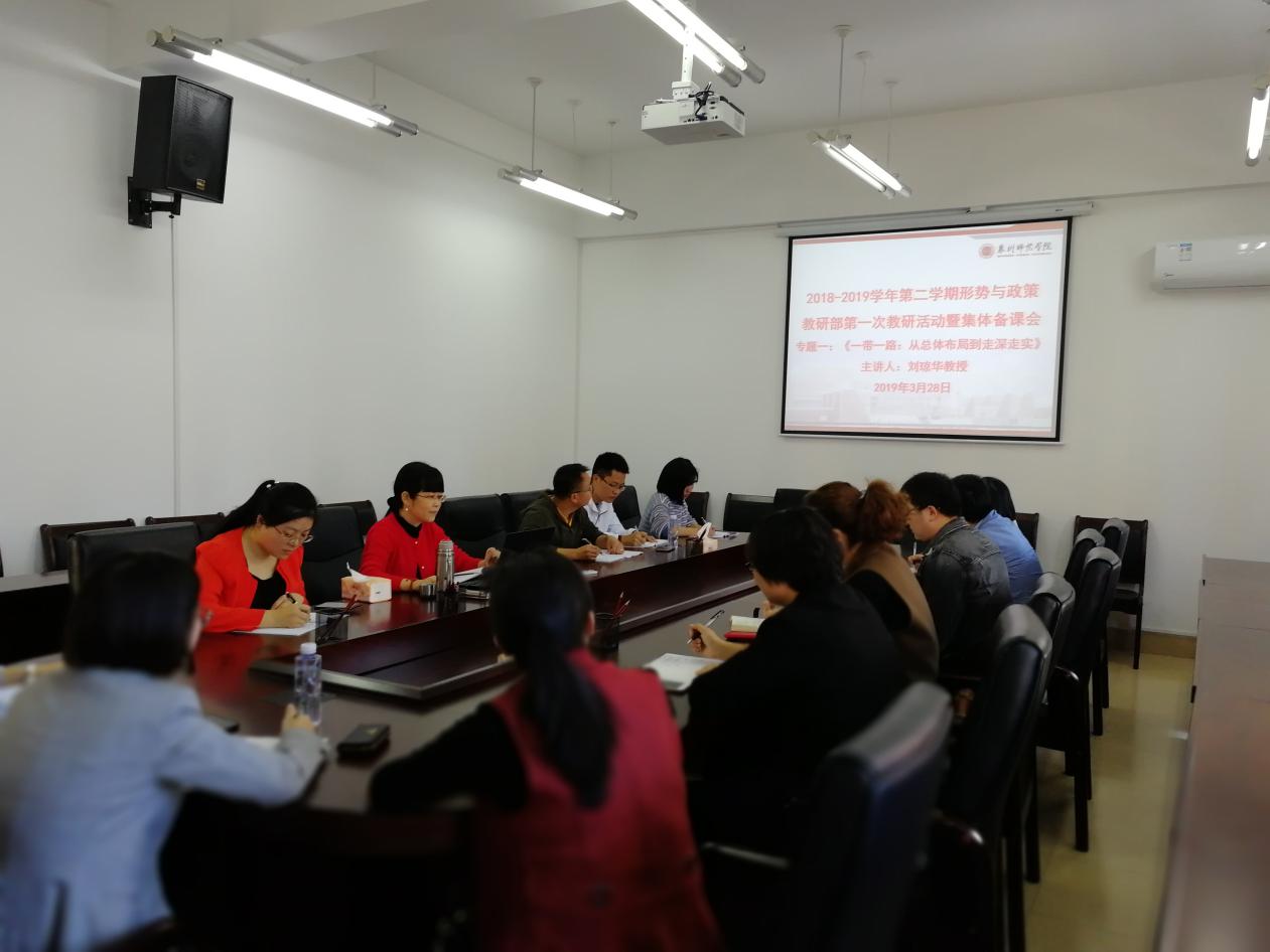 2019328日,马克思主义学院形势与政策教研部在文科楼A414室成功举行2018-2019学年第二学期第一次教研活动暨一带一路”:从总体布局到走深走实(专题1)集体备课会。本次集体备课会邀请刘琼华教授做辅导授课。刘教授从教学目标、教学重点、教学过程中要厘清的几个概念教学方法四个方面向各位任课教师做了全面辅导,帮助大家能够更好地吃准吃透本专题的教学内容,进而促进课堂教学质量不断提高。
