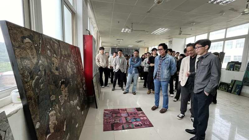 此次活动由在观摩过程中,专家组对我院的作品进行了专业点评,对于作品的题材、形式、手法等都展开十分详细的建议。师生们互动交流。专家组对于相关作品的坚守与创新给予了充分的肯定,鼓励具有时代创新性的作品,同时也指出了部分作品的不足,针对相关问题,专家组提供了详细的指导意见,漆画应如何做到思想精深、艺术精湛、制作精良等问题。首先,还是应该从漆画的本体“漆性”入手。漆画作者应该坚守漆画原本的魅力,研究传统文化,分析漆画的魅力,认真打磨等,为我院师生的后续创作提供了思路和方向。