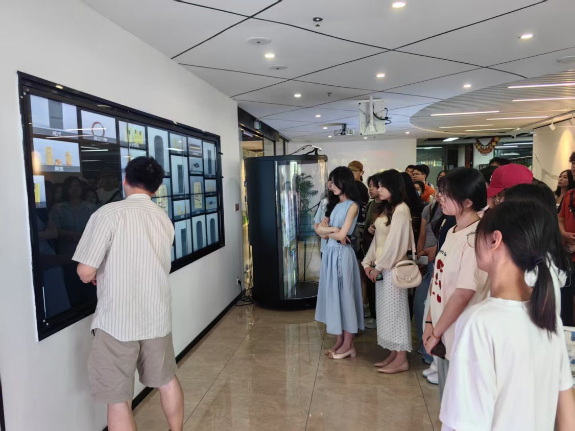 在参观交流过程中,同学们深入了解了华南数字产业展馆展厅的设计理念与布局规划、数字文旅项目的创新应用、数字影片的制作流程、多媒体展示的多元化形式、互动媒体应用的前沿技术、沉浸式全息技术的震撼效果、数字党建的创新模式、智慧园区的智能化管理以及 AI 数字人的开发与应用等丰富知识。这些前沿的数字化技术和创新应用案例拓宽了同学们的视野,激发了大家对视觉传达设计与数字科技融合的浓厚兴趣和创作灵感。同样地,在分享座谈会上同学们积极与企业人员互动交流,企业人员结合实际案例和行业发展趋势,为同学们详细讲解了数字产业人才的需求特点和培养方向,进一步明确了同学们在大学期间的学习目标和努力方向。