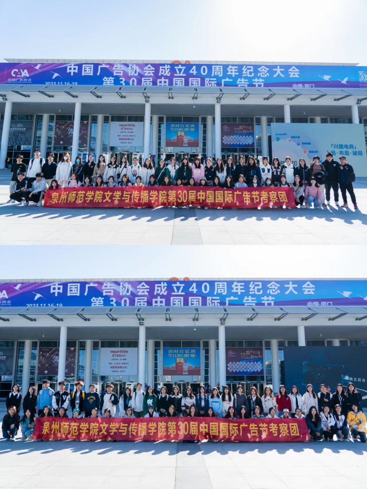 11月17-19日,第,30届中国国际广告节在厦门国际会展中心举办。11月17-18日,文学与传播学院新闻传播系广告、广电专业22级、23级全体本科生及在校的研究生,分成两批,组成“第30届中国国际广告节专业见习考察团”,全程参与了17、18日当天的重要活动,进行了为期2天的专业见习活动。