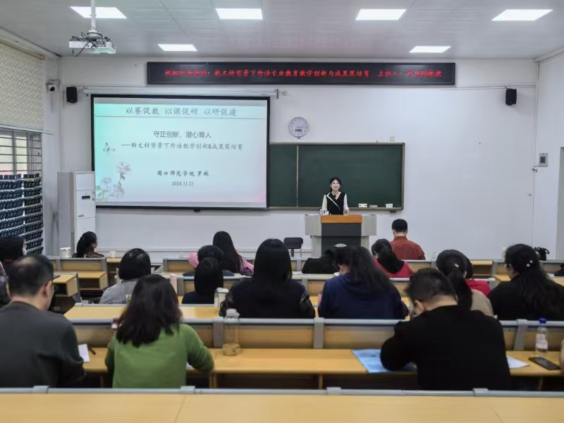 2024年11月21日,周口师范学院外国语学院罗瑞副教授应邀来我院开设“新文科背景下外语专业教育教学创新与成果奖培育”的专题讲座。讲座在外112教室举行,黄诗海副院长及陈伟红主任共同主持,学院全体教师参与听讲。