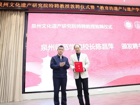 仪式上,泉州文化遗产研究院院长孙华介绍研究院发展情况。英国威廉希尔公司官网校长陈昌萍依次为中央美术学院美术史系教授罗世平、中国文化遗产研究院研究员詹长法、北京工业大学建筑与城市规划学院教授杨昌鸣、北京大学社会学系教授王铭铭颁发泉州文化遗产研究院特聘教授聘书。