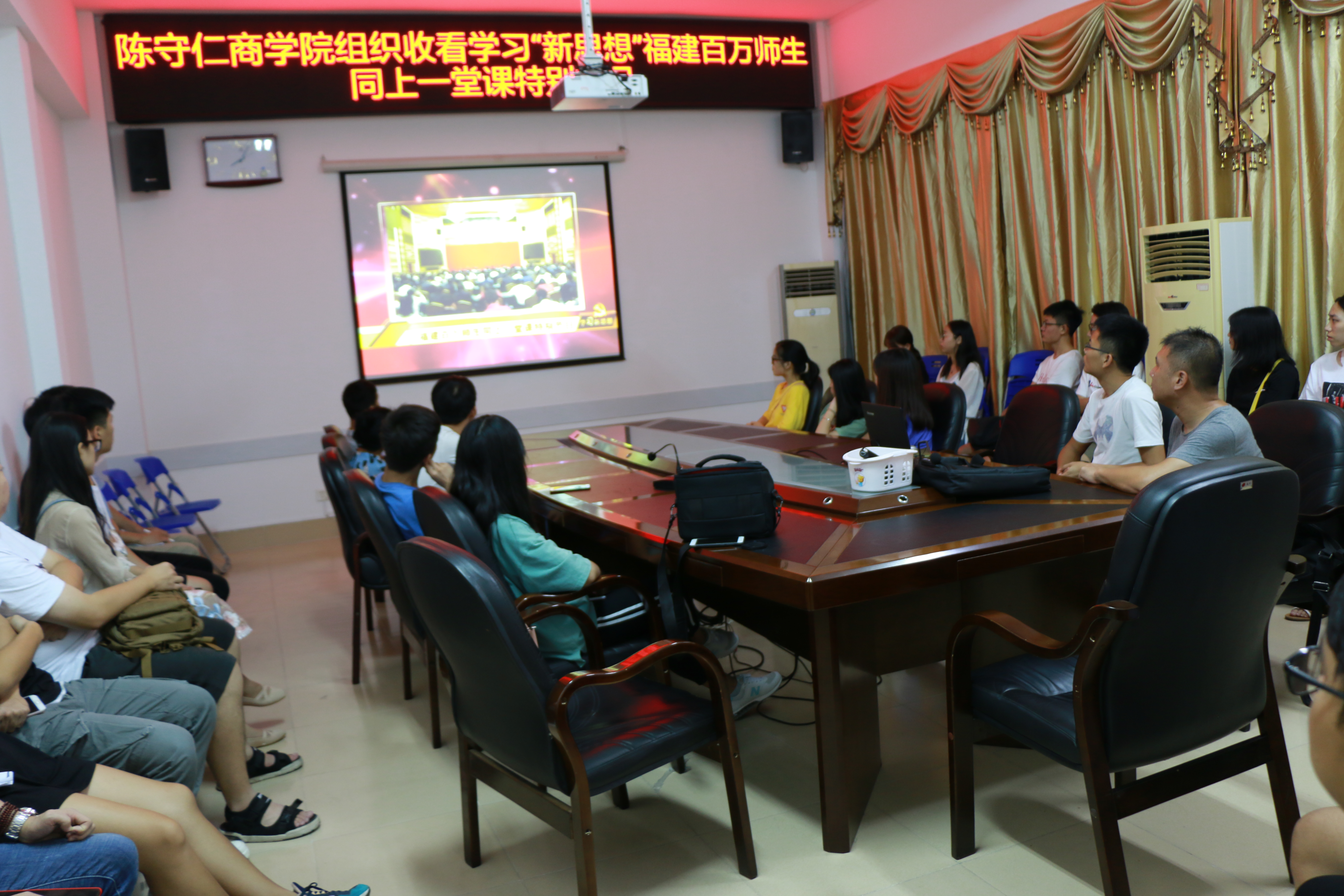 为推动学习习近平新时代中国特色社会主义思想活动的深入开展,我院于9月3日晚组织16、17级学生干部共同观看了福建教育电视台摄制的“学习新思想,福建百万师生同上一堂课特别节目”。院学工办负责人刘礼元老师主持本次学习活动。