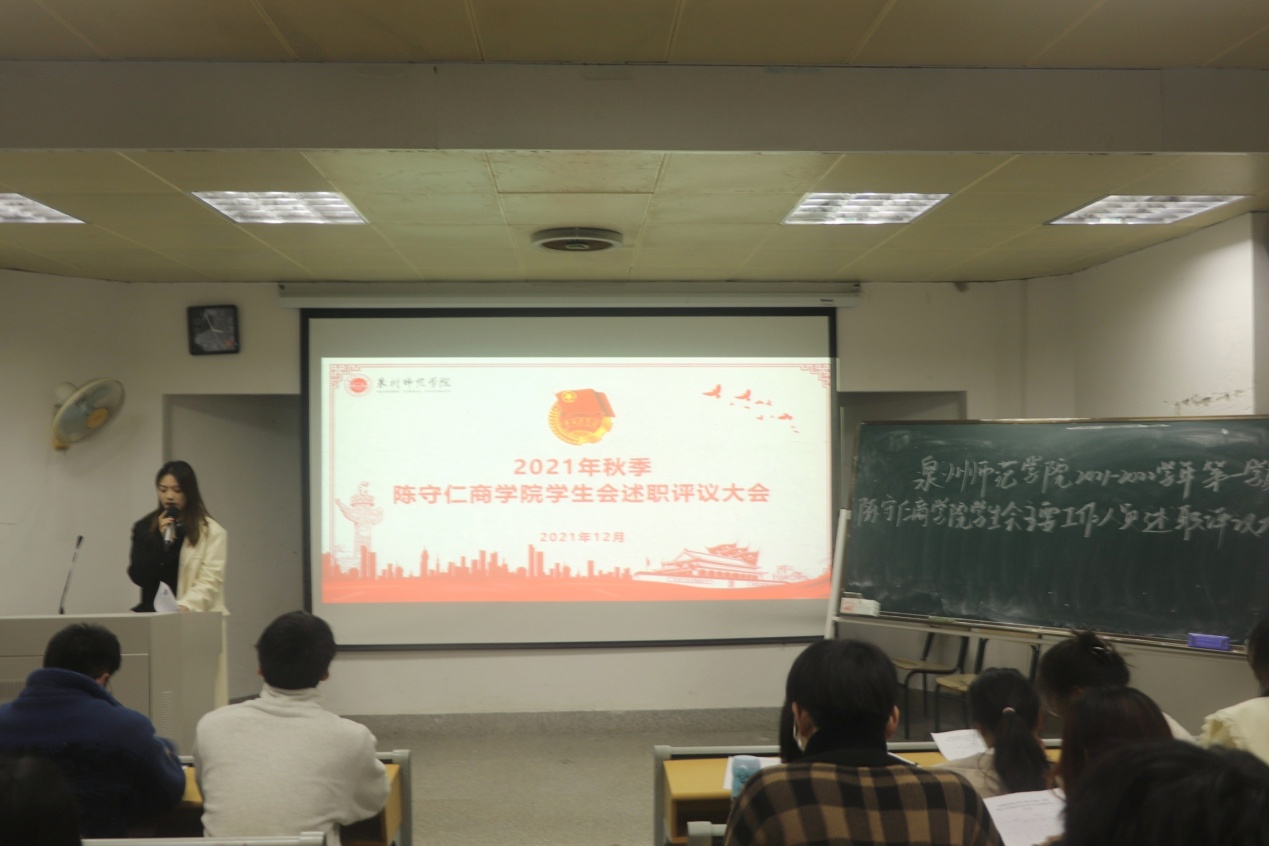 为全面总结本学期学生会工作情况,陈守仁商学院于12月23日在文科楼B313教室召开2021-2022学年第一学期学生会述职评议会。本次会议由学生会执行主席刘咏怡主持,学生会各部门负责人、各部门工作人员以及部分学生代表参加。