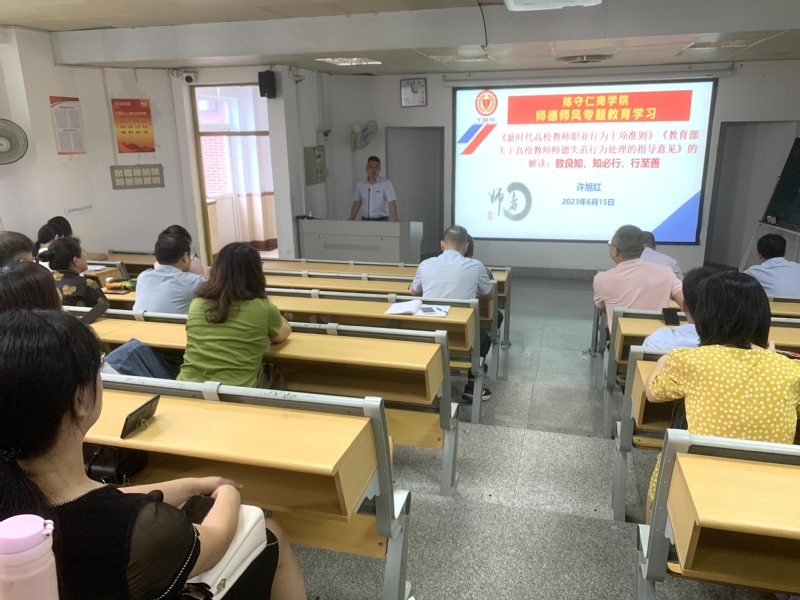 61日下午,我院召开师德师风专题教育第一次大会。学院党委书记通报了近期几起因师德失范引发的舆情和近期教育部公开曝光的11起高校教师违反师德师风的典型案例。他强调,要通过此次专题教育活动,进一步加强师德师风建设,提高教师师德修养,规范教师从教行为,增强教师教书育人、以身立教的社会使命感,努力提高我院教师的思想政治素质和职业道德水平,不断改善和巩固学院教风学风建设。