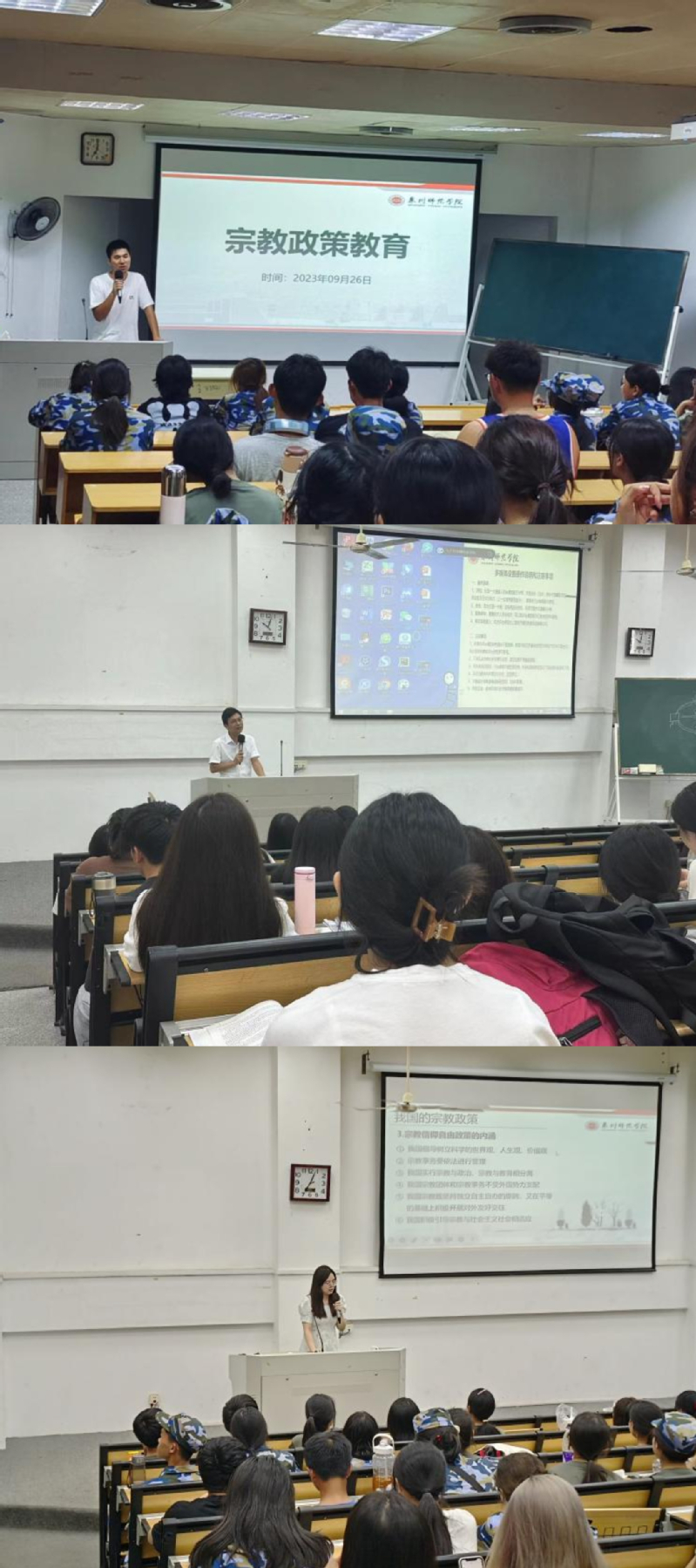 926日,陈守仁商学院组织开展宗教政策教育。新生辅导员与自律会宣讲团成员阐述了宗教的本质、产生和存在的根源,以及我国宗教的基本特点,强调了党的宗教工作基本方针,坚持教育与宗教相分离原则,要求同学们正确认识和对待宗教问题,自觉抵御西方敌对势力利用宗教对高校进行的渗透,树立正确的世界观、人生观和价值观,不断提高思想道德素质和科学文化素质,坚定共产主义信仰,努力成为德智体美劳全面发展的社会主义建设者和接班人。