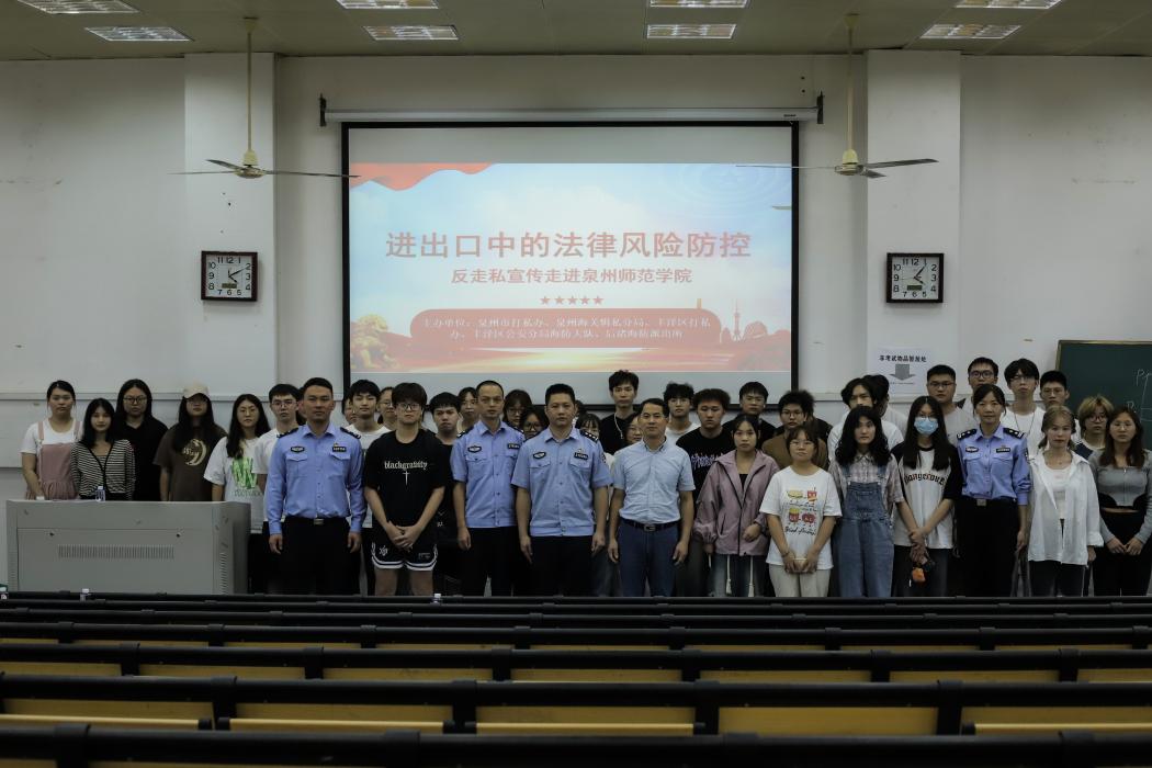 为扎实开展2023年党风廉政建设宣传教育月“一院一特色”----“清廉金融文化进校园”系列活动,提高经管类学生对进出口商务活动法律风险的防控意识,陈守仁商学院于11月2日在文科楼举办以“进出口中的法律风险防控”为主题的法制讲座。本次讲座由泉州海关缉私分局、丰泽打私办、丰泽公安分局、后渚海防派出所和陈守仁商学院联合举办,泉州海关缉私分局一科副科长邱水源主讲,商学院党委副书记曾文超主持。